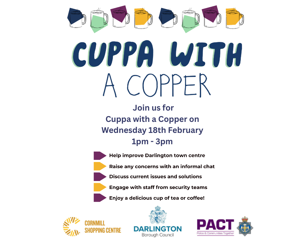 Following the continued success of our community outreach initiative, we are proud to confirm that ‘Cuppa with a Copper’ will return for 2026. This unique partnership between Durham Police, Darlington Borough Council, and the Cornmill Shopping Centre maintains a joined-up approach to ensuring Darlington Town Centre remains a vibrant and safe destination for everyone.
